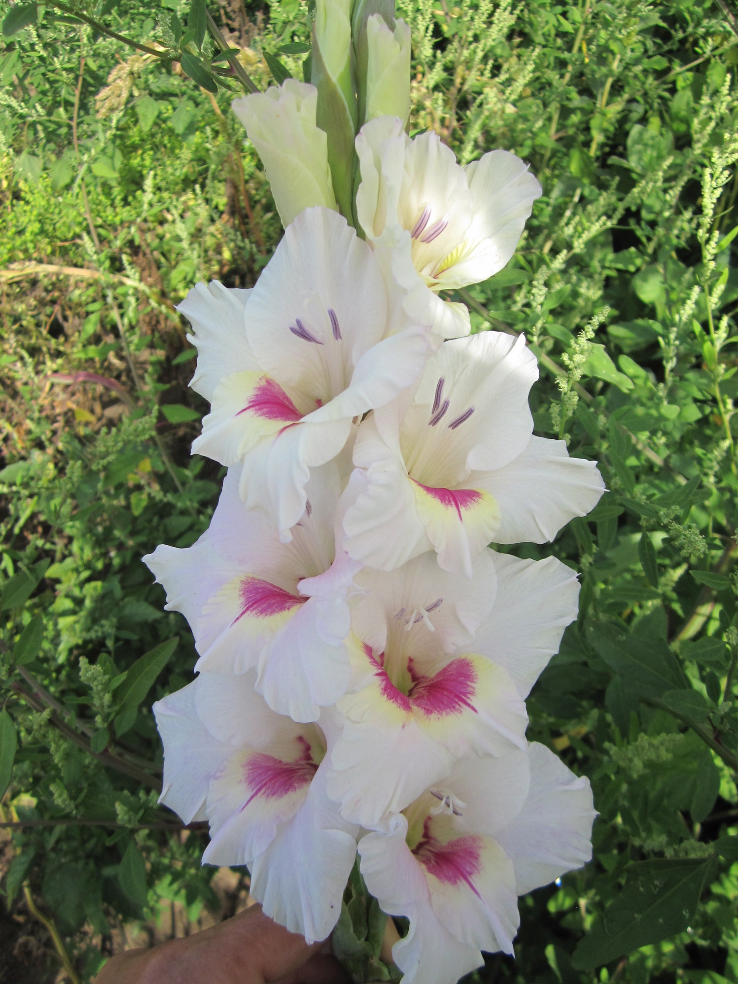 A white with a large distinctive pointed blotch in lower throat as though each floret was bestowed a big kiss. Medium ruffling, good substance and formal placement. Has done well in shows.