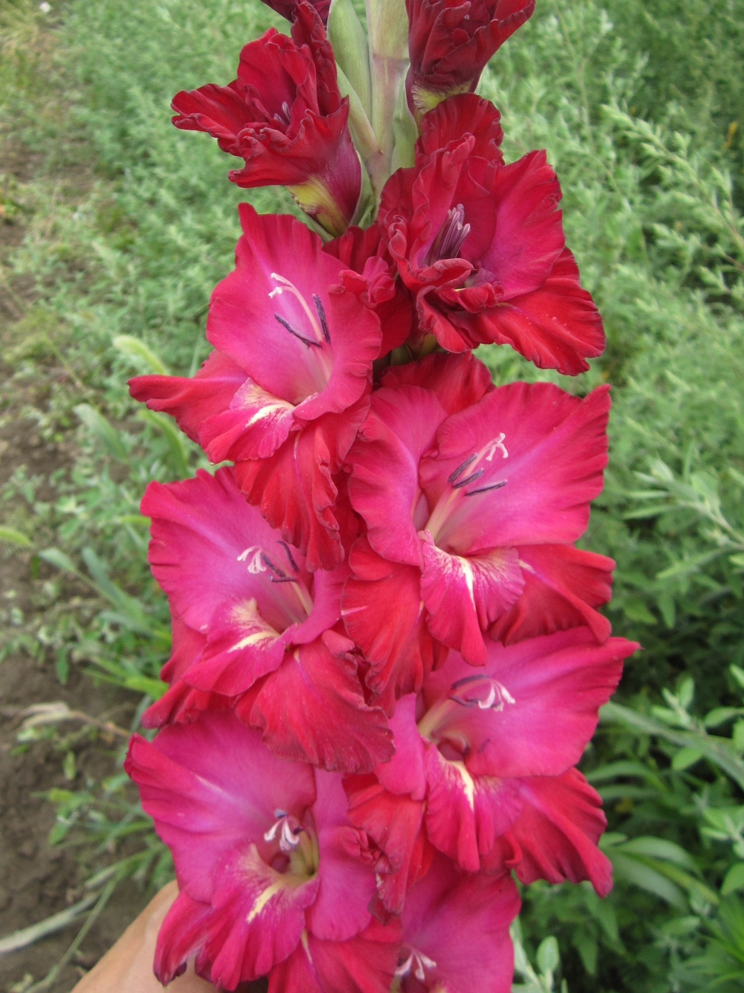 (MA 3/11-3) A deep magenta rose with lovely light yellow frosting and line on lip petal. Holds open upto 10 of 24 buds on 26" flower heads. The 4 1/2" florets have medium ruffling and of medium heavy substance in formal plants. Robust tall plants. (473 Bohyna x 399 Forkys)