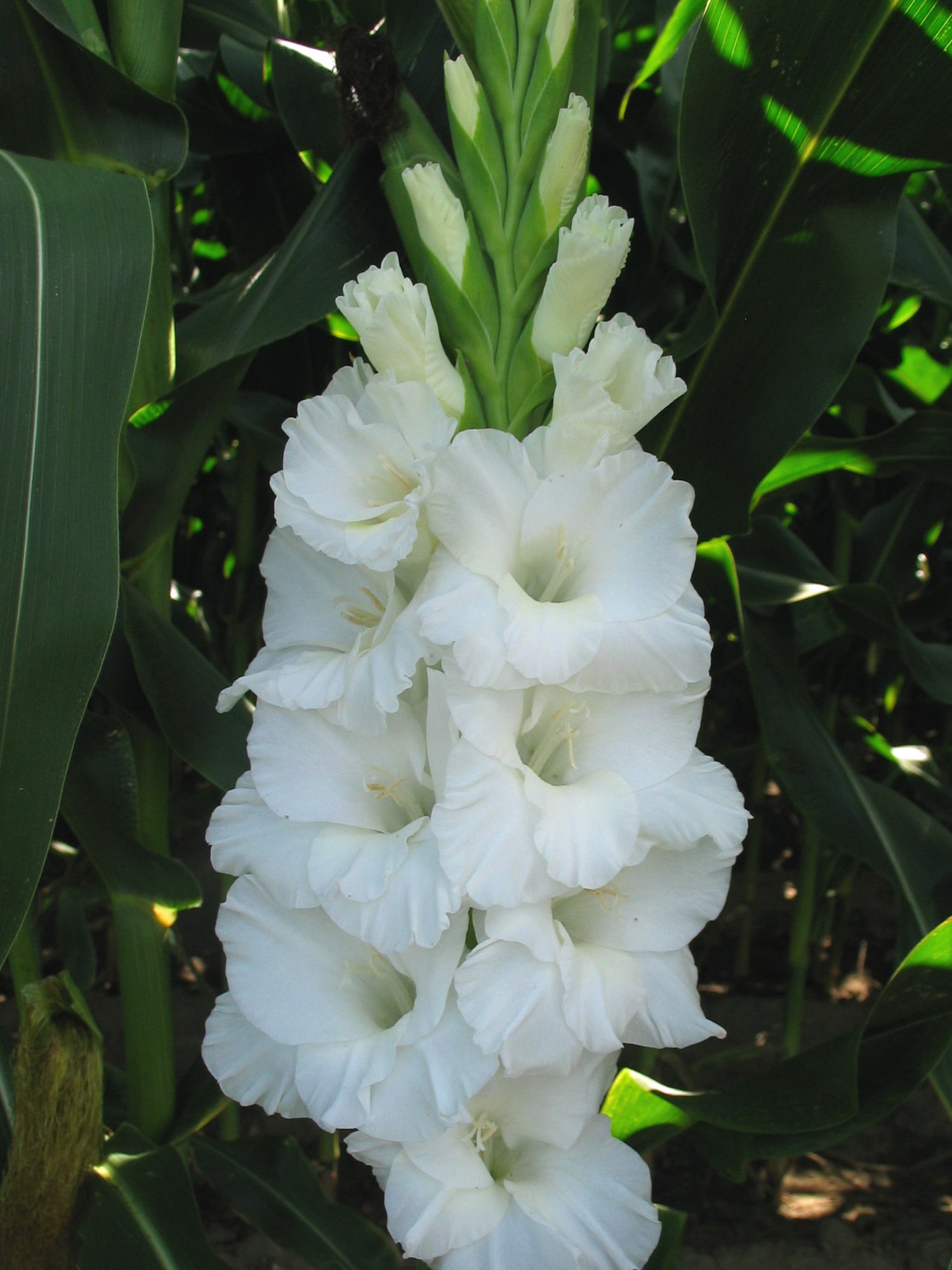A fine pure white with 5" ruffled florets. Holds 10 open of 29 buds on 26" tailored flower heads in formal placement. Consistently produces straight spikes right down the row with luscious green foliage.